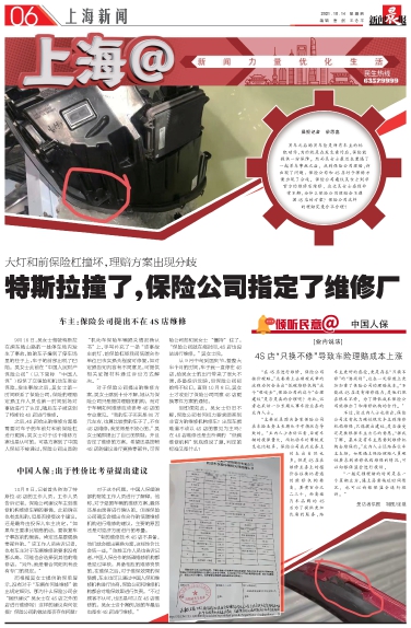 10月8日,记者首先咨询了特斯拉4S店的工作人员,工作人员告诉记者,保险公司建议车主到维修机构维修车辆的事情,此前确实也有类似的,但是否接受这个建议,还是最终由投保人车主决定,“如果车主要求比较高的话,要恢复车子事故前的原装,肯定还是要更换零部件的。”该工作人员告诉记者,也有车主对于车辆维修的要求没有那么高,可能也会选择到其他的维修店。“另外,就是看合同细则有没有专门的规定。”