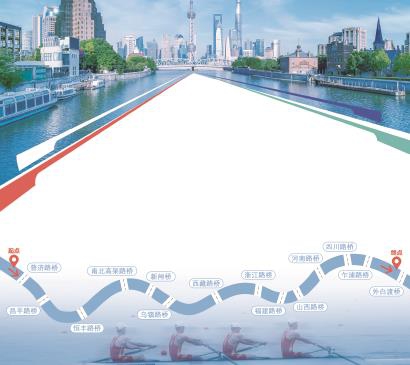 如今的苏州河水清岸绿,水环境治理成效显著,沿岸公共空间贯通开放。赛事航道西起普济路桥、东至外白渡桥,途经苏州河上大大小小14座桥梁,路过晋元纪念广场、上海邮政总局大楼、上海大厦等多处地标性建筑。外白渡桥为本次赛事的终点,从赛艇选手冲线的视角,可以观赏到浦东“三件套”和外白渡桥融为一体的景观。把苏州河沿岸景观融入到赛事航道布局中,“上艇”又一次展现了“景观体育”的理念。这是上海着眼于建设国际体育赛事之都,按照“一江一河”发展规划创办的自主品牌赛事,彰显申城内涵特质。