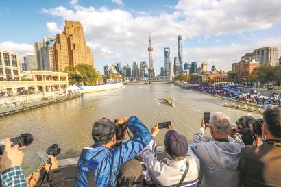 晨报首席记者任国强摄影报道 昨日下午,2021上海赛艇公开赛在苏州河上拉开大幕,本次赛事是全国首创的八人艇城市赛艇比赛,也是上海创办的城市自主品牌赛艇赛事。当天,申城蓝天白云,气候宜人。参赛的赛艇在苏州河上尽情驰骋,勾勒出一幅百舸争流的壮丽场景。赛艇好似离弦之箭,破水前行。苏河两岸,前来观赛的市民为运动员呐喊助威。