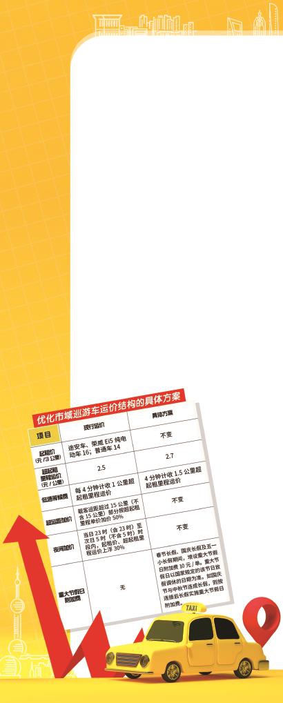 为优化市民出行结构、提高巡游车服务品质、增强驾驶员职业吸引力,本市将优化市域巡游车运价机制(区域性巡游车运价已授权所在区人民政府制定)。昨天,市发展改革委网站上发布了听证会第二次公告,据公告内容,本次巡游车运价调整可以概括为“三不变,两优化,一增设”。“三不变”指的是起租价、超运距加价、夜间加价三项不变。“两优化”指的是超起租里程运价、低速等候费两项优化。“一增设”指的是增设一项重大节假日附加费。这也是市域巡游出租车时隔6年再次调整运价。