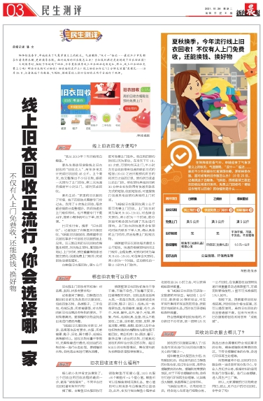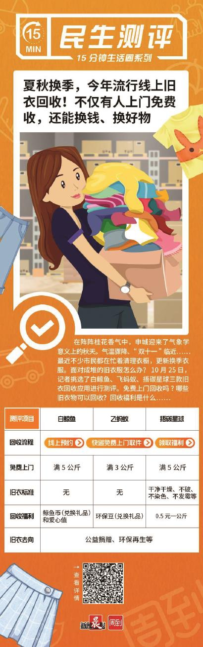 又到换季时,相较于传统线下回收,今年夏秋换季线上旧衣回收逐渐走红,那么,线上旧衣回收免费上门吗?哪些旧衣物可以回收?回收福利是什么?线上回收如何让“15分钟生活圈”更便民……10月25日,记者挑选了白鲸鱼、飞蚂蚁、捂碳星球三款旧衣回收应用平台进行了测评。