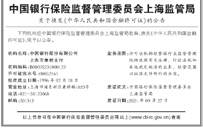 中国银行保险监督管理委员会上海监管局关于换发《中华人民共和国金融许可证》的公告