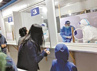 医院门口四五个全副武装的医护工作者和安保人员,在维持着排队秩序,同时向市民耐心解答问题。大家井然有序地先预检、再缴费,最后排队做检测。
