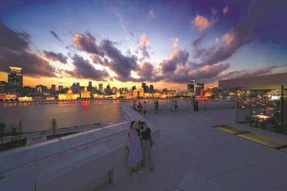 入夜时分,站在浦东美术馆的不同点位,可以观赏到不同的美景。18点,站在浦东美术馆外的亲水平台,当夕阳已沉入万国建筑群背后,白天的自然光线在美术馆建筑表面一点点褪去。这时,美术馆的轮廓灯亮起,白天看起来“白盒子”一般的美术馆,突然在夜晚散发出了一种金黄的光晕。