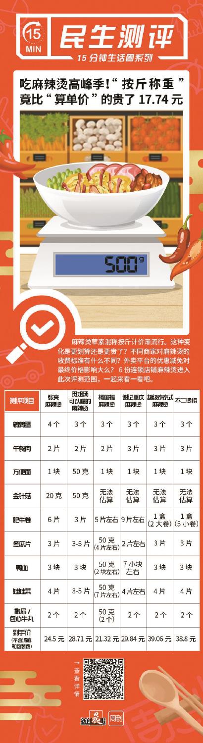 为了方便比较,在食材的选择上进行了统一,6份麻辣烫均选择了鹌鹑蛋、午餐肉、方便面、金针菇、肥牛卷、冬瓜片、鸭血、娃娃菜、撒尿/包心牛丸这九种菜。