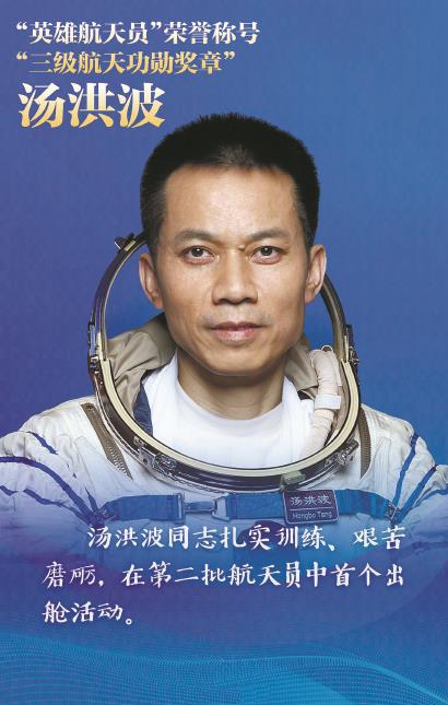 神舟十二号载人飞行任务圆满成功,凝聚着广大科技工作者、航天员、干部职工、解放军指战员的智慧和心血。聂海胜、刘伯明、汤洪波同志是其中的杰出代表,他们听令景从、矢志报国,不畏艰险、团结协作,向世界展示了强大的中国精神、中国力量。聂海胜同志3次执行载人飞行任务,2次担任指令长,成为首位在轨100天的中国航天员。刘伯明同志十余年如一日砥砺坚守,两度飞天圆梦,此次任务2次出舱活动。汤洪波同志扎实训练、艰苦磨砺,在第二批航天员中首个出舱活动。为褒奖他们为我国载人航天事业建立的卓著功绩,中共中央、国务院、中央军委决定,给聂海胜同志颁发“一级航天功勋奖章”,给刘伯明同志颁发“二级航天功勋奖章”,授予汤洪波同志“英雄航天员”荣誉称号并颁发“三级航天功勋奖章”。