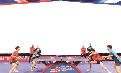休斯敦世乒赛主赛场内,一号球台摆在正中央,两端的混双选手球衣一红一蓝,画面既新鲜又和谐。