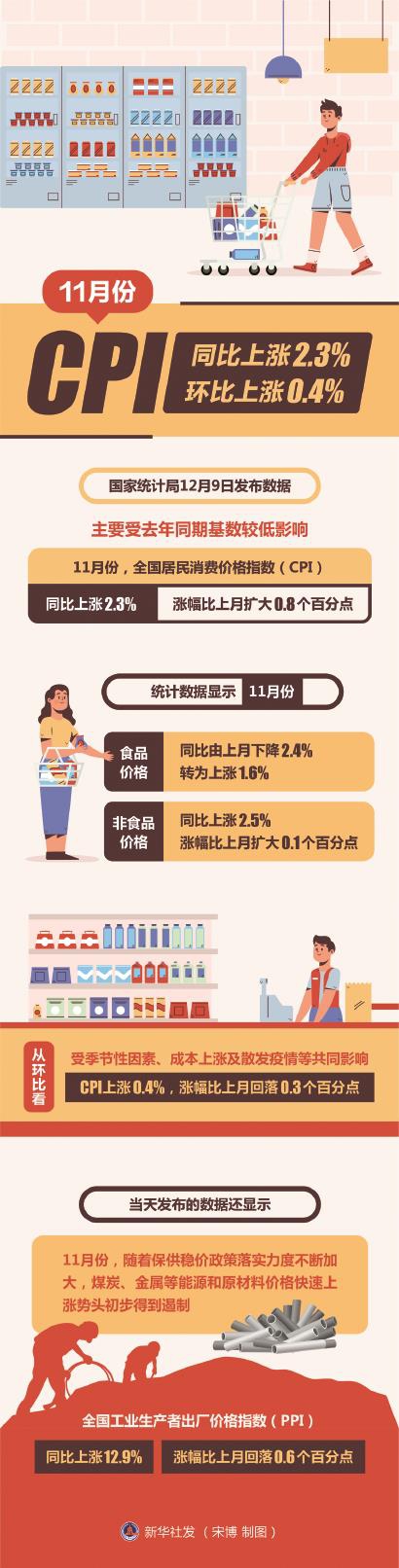国家统计局9日发布数据,主要受去年同期基数较低影响,11月份,全国居民消费价格指数(CPI)同比上涨2.3%,涨幅比上月扩大0.8个百分点;环比上涨0.4%,涨幅比上月回落0.3个百分点。