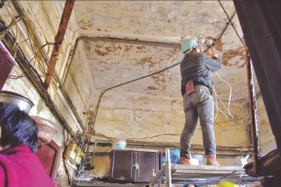 12月9日,《新闻晨报》刊登了《百年虹口救火会大楼内隐患有点多,优秀历史建筑里住着“72家房客”,居民最担心火烧连营》一文,15天过去了,这栋被破旧家具以及生活垃圾堵塞的“历保”大楼,昨天终于迎来了整改动作:拆换水房里蛛网一样的电线。