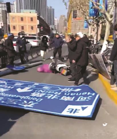 昨日12时36分许,这名女子骑车沿四川北路南向北刚刚驶过昆山路。这时,位于四川北路东侧上街沿的道路指示牌突然倒下,不幸将其砸倒在地。