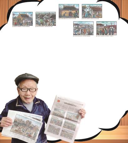 报纸版面上的一个个长方格,每一幅他都画过四五遍。“第一稿用铅笔打轮廓,构思人物建筑,第二稿画出具体的外形和布局,第三稿对局部细节进行修改调整,第四稿用画笔将人物建筑描深,第五稿用颜料对画作进行上色,成稿。”
