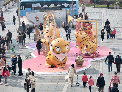 晨报记者任国强摄影报道 元旦假期,徐家汇六百广场上5只憨态可掬的生肖萌虎艺术装置成为节日里热门打卡点。有正在拱手作揖拜年的老虎、好似大橘猫的老虎、派发红包的老虎,还有伸着懒腰盯着毛线球发呆的老虎,萌萌的老虎造型寓意着新年五福临门、吉祥如意。