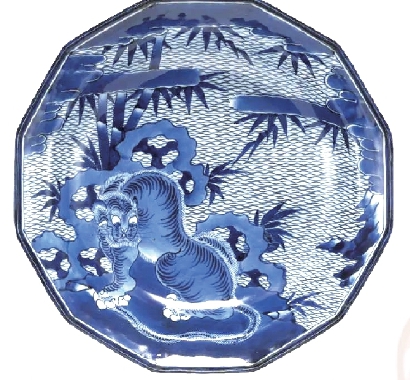 日本九洲国立博物馆藏的青花虎竹图十二角形盘烧制于日本有田窑。16世纪末,日本武士家族在宴会时盛行使用大盘摆放菜肴,起初他们用中国瓷盘,17世纪初,有田窑兴起后,日本本土制作的大盘渐渐成为上流社会餐桌上的奢侈品,此类虎竹图大盘受到了广泛青睐而传世最多。