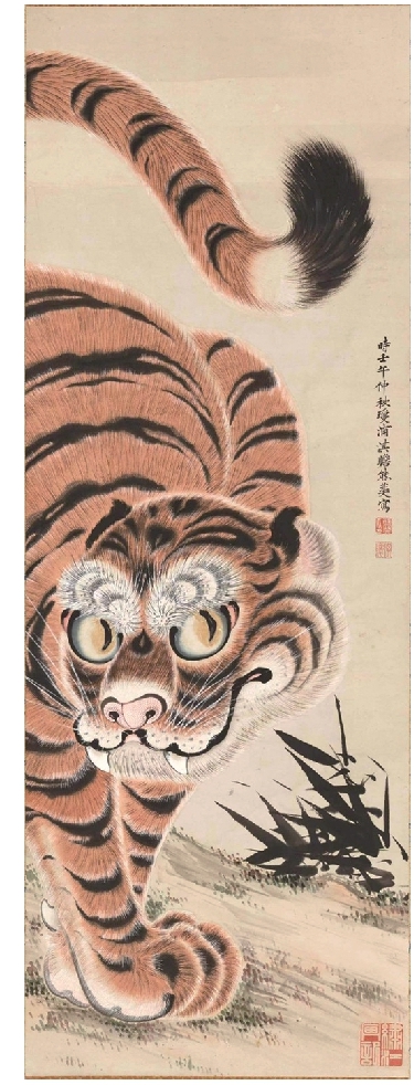 土方稻岭出生于日本武士家族,却立志学画,入熊斐的弟子宋紫石门下。因擅长中国画家沈铨风格的花鸟走兽图而小有名气,于1798年成为鸟取藩藩王的御用画师。画中猛虎威严笃定,款步而行,用笔柔韧细致,主题喜庆吉祥。这类“猛虎图”的主题与风格是18世纪以后受沈铨花鸟走兽图影响而形成的,在日本各地流行甚广。