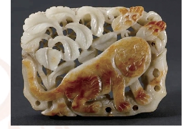 上博馆藏金代秋山玉饰正面采用透雕手法表现柞树、山石、灵芝等山林景象,其间一老虎蹲坐回首,头部及毛发刻画细腻,充满山林野趣。玉饰局部巧用玉料皮色来表现老虎的皮毛及灵芝,属于“俏色”工艺。“秋山”是什么意思呢?因为在辽代,每逢春、秋两季统治者要外出行营并渔猎,金代继承此习俗并更名为“春水”“秋山”。“春水”和“秋山”玉便成为金元时期极具特色的玉器品类。