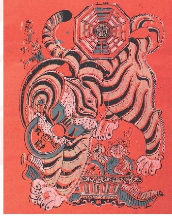 老虎不但是驱邪避灾的镇宅神兽,也是象征财富的金钱虎。这幅年画中的老虎嘴中衔有“招财进宝”铜钱,身前也有装满珊瑚、如意、“春招财子”铜钱等各类财宝的聚宝盆,虎背上方印有太极八卦,满身的吉祥图案反映着百姓求财驱邪的心理。作品造型生动活泼,用色对比强烈,体现了鲜明的民俗文化特色。