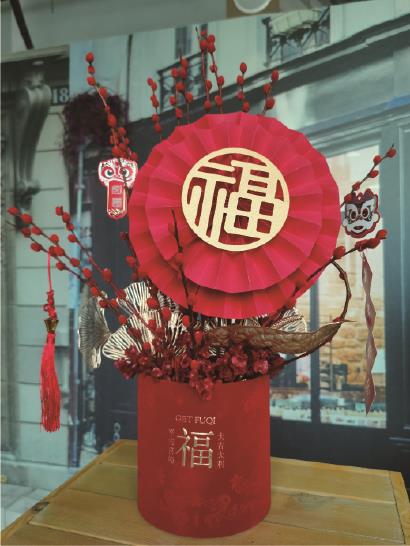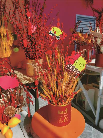 葡香花市里还摆满了各种融合国潮元素和创意材质,创意混搭的福桶,里面包含了银柳、银杏叶、尤加利叶、折扇、红灯笼、中国结等年味儿十足的小配件,质感高级不庸俗,作为年宵花礼,可谓是年味十足又不俗气,不管送礼还是自留都相当合适。