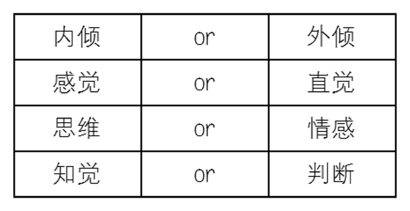 “四维”是指描述精力来源的“内倾(I)—外倾(E)维度”、描述认知方式的“感觉(S)─直觉(N)维度”、描述判断方式的“思维(T)─情感(F)维度”,以及描述生活方式的“知觉(P)─判断(J)维度”。