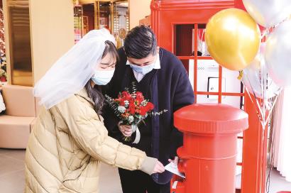 晨报记者陈里予摄影报道 昨天是2022年2月22日,星期二,农历正月廿二,被网友称为“最有爱的日子”。各区婚姻登记中心迎来婚姻登记热潮。其中,嘉定婚姻管理所为新人带来了一份难忘精彩的婚登体验互动:不仅可以拍摄专属的封面大片,成为封面CP,还能在特设的“爱的电话亭”,向父母或者彼此间留下爱的语音,并设计专属明信片。这张明信片也将盖上2·22的邮戳,传递这份喜悦,留下一份值得珍藏一生的纪念。