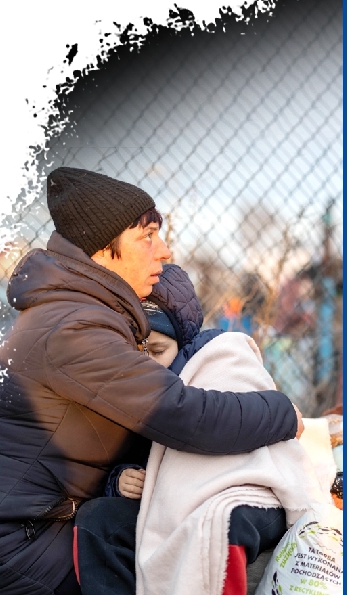 26岁的尤利娅刚从乌克兰来到这里不久。她怀里抱着一岁的小儿子,正从志愿者那里领取方便食品,身旁的大儿子则调皮地把头扎进一个装满毛绒玩具的箱子里。