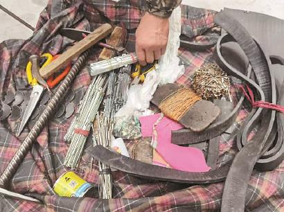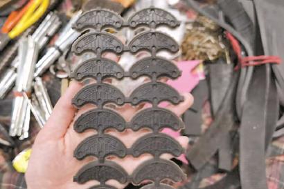 “以前的鞋子缝线的多,牢,质量好,修起来也比较麻烦。现在大多数用胶水,修起来容易一些。”老曹告诉记者,他刚开始摆摊时,工具很少,修理的也只有鞋子,渐渐的,随着居民需求的增加,他的修理工具也越来越多,掌握的修理手艺也越来越丰富。老曹打开了自己日常携带的包袱皮,里面既有补鞋跟的牛筋底,也有修阳伞的各种金属钩……林林总总有数十种。“居民需要了,我就去买了。”