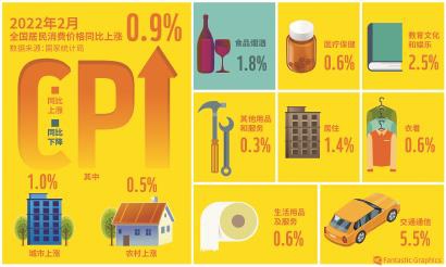 国家统计局9日发布数据显示,2月份,全国居民消费价格指数(CPI)同比上涨0.9%,涨幅与上月相同,国内物价总水平继续保持平稳运行。