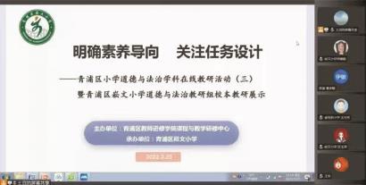 3月25日下午,青浦区小学道德与法治学科教师研修基地开展了主题为“明确素养导向,关注任务设计”的在线教研活动。活动由基地主持人、青浦区教师进修学院小学道德与法治教研员熊江婷主持,云南芒市风平镇中心校领导及学科教师、本区各校道法教研组长、学科教师近百余人通过腾讯会议观摩并参与研讨。