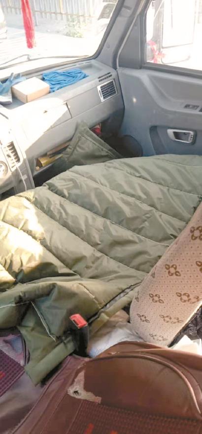 张茂松是负责为“老友记”配送食材的美团快驴送货司机,为了保证供应,连日来,他都睡在自己的送货车里。“铺上硬纸板,搞了一条薄被子,就在车里睡。”