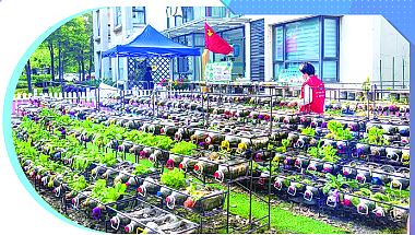 周永绯告诉朱先生,这些瓶子都是居民送过来的,轮胎是居委干部找来的,里面装满了营养土,“营养土有一部分是我们买的。还有一部分是把湿垃圾放进机器里,搅拌发酵后晾干,和泥土混合而成的。”