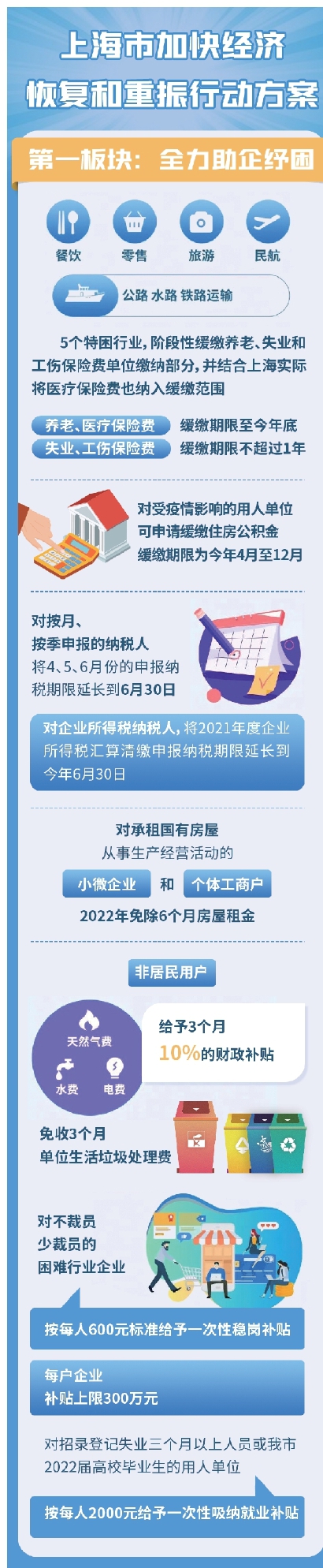 第一板块主要是全力助企纾困。针对企业实际困难,从阶段性缓缴“五险一金”和税款、扩大房屋租金减免范围、多渠道为企业减费让利、加大退税减税力度、发放援企稳岗补贴等方面,综合实施“缓免减退补”政策,多管齐下为企减负。比如对餐饮、零售、旅游、交通运输、文体娱乐、住宿、会展等困难行业企业给予一次性稳岗补贴,对符合条件的用人单位给予一次性吸纳就业补贴。
