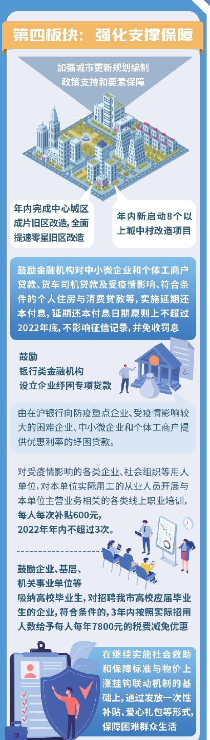第三板块主要是稳外资外贸、促消费投资。围绕稳外资稳外贸、促进消费加快恢复、发挥投资关键性作用等方面,提出了一系列有力度的政策举措,全面增强经济内生动力。比如,以大宗消费为抓手,年内新增非营业性客车牌照额度4万个,按照国家政策要求阶段性减征部分乘用车购置税,对置换纯电动汽车的个人消费者给予一次性10000元补贴,支持大型商贸企业和电商平台发放消费优惠券,支持文创、旅游、体育产业发展,大力促进消费加快恢复。