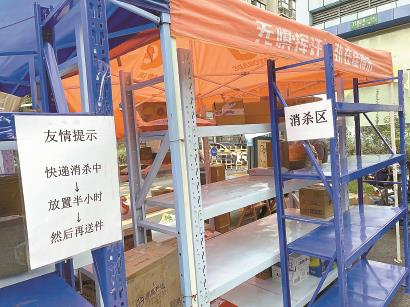 在一品新筑苑小区门口,搭了一个四层的货架,上面还拉了雨棚遮阳挡雨。记者看到,货架一侧分别设置了消杀区和清洁区,另一侧则按照楼栋号标注了摆放区域。所有的快递和外卖到达后,先要经过消杀,再静置半小时,然后根据楼栋号摆放在相应的位置,等待居民自取。