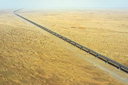 和若铁路一路向东穿越沙海,延伸至甘肃、青海和西藏交界的若羌县。它与现有格库铁路、南疆铁路共同构成一条2712公里的环形铁路,“环抱”塔克拉玛干沙漠。