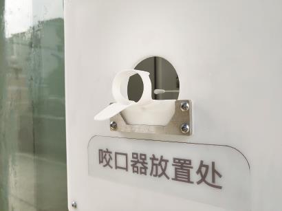 记者根据操作示意图取出一个一次性咬口器,将其插入采样窗口处卡槽,咬住咬口器上方缺口处,舌头置于压舌板下方,点击采样按钮。