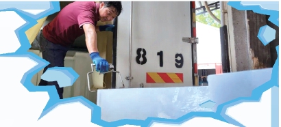 这些“出炉”的冰块一部分会通过轨道滑入车里,另外一部分则进入储冰室,等待买家上门取货。此时,高师傅戴上手套、穿上厚厚的军大衣,钻入储冰室内,整理冰块。此时,室外温度36℃,酷热难耐,而室内却只有-3℃左右,寒气逼人。极端的冷热之间,真正让人体验到“冰火两重天”的感觉。“大家都以为夏天在冰库比较舒服,其实不是那么回事,一会儿汗流浃背,一会儿浑身发冷,这个活不好受。”高师傅说。