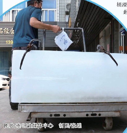 “前阵子上海连续近40℃高温,浦东康桥一个汽车零配件企业找到我厂里,采购了一批冰块,据说是他们原来的冰块供应商来不及生产了,我前后给那个企业送了3车冰块,总共六七百条。还有一个冰块贩子也找过来,说是给宝山区的核酸采样点供应冰块。那阵子,市区还有其他郊区的几个制冰厂都很忙,有的来不及供货,所以有些急需用冰的企业就找到崇明来了。”温琴广说,他的制冰厂多年来一直是供应崇明本岛用冰,主要是城桥镇、陈家镇等几个大的农贸市场,难得连日高温,市区的生意也找过来。