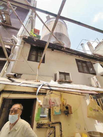 “有一天晚上,房顶塌了,女儿还没下班回来。我想找物业修,但是房顶下面那么多东西没地方搬,只能等女儿来了一起修。”
