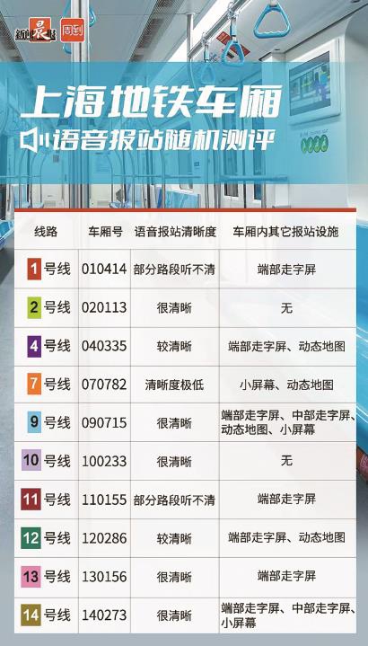 在4号线列车,记者听到3次播报信息,语音相对清晰。12号线语音播报声音也较清晰,且配有端部走字屏和动态地图。2号线车厢语音播报清晰,但车厢无走字屏。