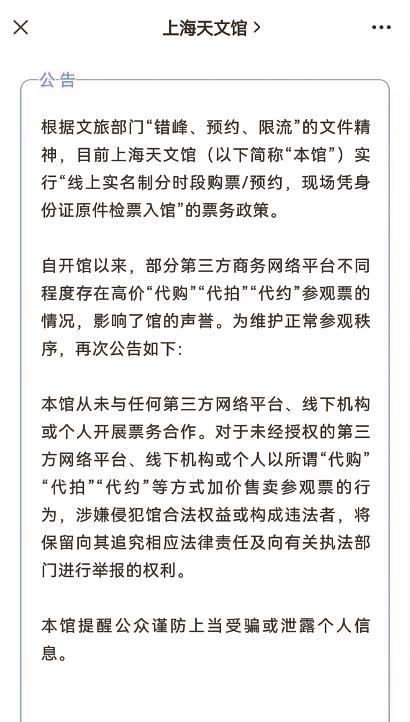 上海天文馆相关工作人员也表示,第三方平台购票真假难辨,建议消费者从正规渠道进行购票。