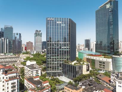 塔楼+裙楼、石材+玻璃,延续“挺拔向上”之气