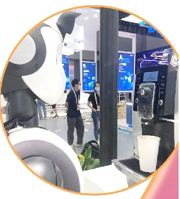 展台现场,还有一个会做咖啡的机器人,只要你跟它说,“来一杯咖啡”,它就会开始制作,完成之后将热腾腾的咖啡端到你面前。