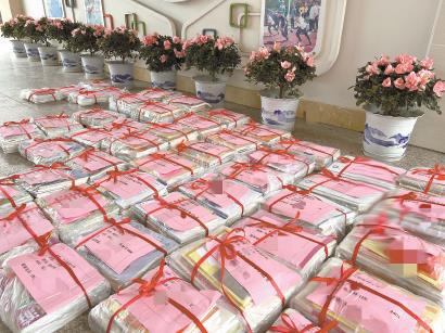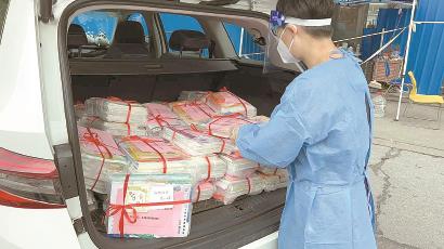 到了下午,一支支“爱心送书队”出现在这些封控小区门口。在城市名园,由于小区的封控管理规定,学校只能将书本送到小区门口,无法送书到家。