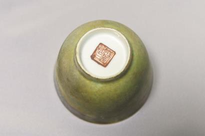 小心翼翼地托起一只清同治景德镇窑绿釉杯,翟杨称这件文物可以被命名为“001”号。绿釉杯小巧玲珑,底部有矾红彩书“同治年制”篆书款识。翟杨表示,这件出水文物的底款,对于长江口二号古船的年代判定起到了重要作用。