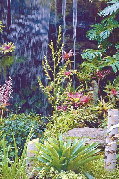 目前,这两棵正在开花的高大鹦哥凤梨已搬到辰山植物园热带花果馆与游客见面。在馆内飞泻而下的瀑布前方,高大鹦哥凤梨优雅地舒展着绿色的花枝,给人以清新脱俗之感,带来一丝沁人凉意。