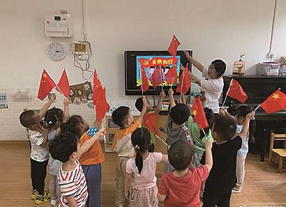 小班的孩子学着用普通话向老师、保育员打招呼。教师编写了“童心向党”的儿歌,孩子们挥舞小红旗,认真地用普通话跟着老师念:“我是好宝宝,从小爱祖国,我们的祖国叫中国,祖国妈妈我爱您!”