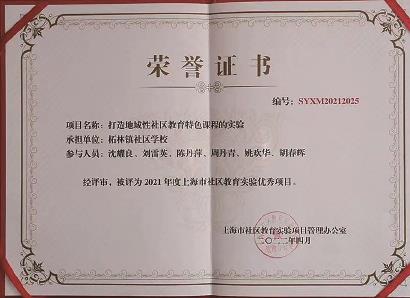 为推进南上海社区教育品质发展,助力镇域社会事业新发展,奉贤区柘林成校坚持多年的上海市社区教育实验项目《打造域地性社区教育特色课程的实验》荣获上海市社区教育实验优项目称号。