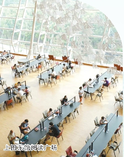 80%的开放空间,可以容纳日均读者访问量约1万人,供读者阅览坐席近6000个,还拥有一个750座的报告厅、小型放映厅、演播厅、室内音乐厅以及各层丰富的活动空间,这些都使得上图东馆真正成为“为人设计的图书馆”。