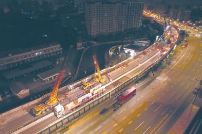 建设团队对整个工程进行了合理、细致的布局和规划,实行白天、晚上两个时间段精准施工方案。白天施工期间保证高架4根车道正常通行;夜间施工期间,高架采取部分封闭、地面交通尽可能不占道、少占道。同时,加强和交警部门沟通,根据施工内容和节点,合理安排交通组织,提前告知公众相关道路封闭或绕行消息,最大限度减小对市民出行的影响。