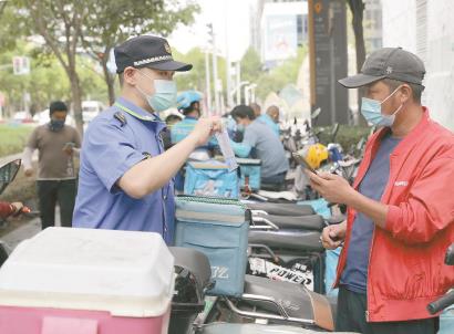 临近中午用餐高峰时段,外卖小哥们穿行于虹桥商务区各大商圈忙碌着,新虹中队城管执法队员也开启了午间时分的街面巡查。巡逻至龙湖虹桥天街购物中心一处公共空间,执法队员走向一位小哥,“你好,请配合扫描场所码。”说着,指了指挂在胸前牌子上的场所码,要求小哥配合疫情防控。