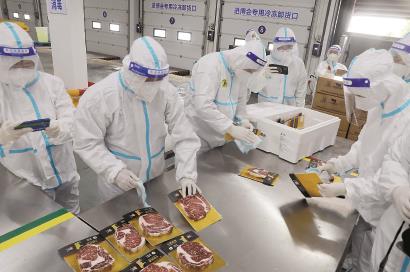 备战进博会进入倒计时!昨天上午9点,本届进博会的第一批进口冷链食品展品——来自新西兰和澳大利亚的牛羊肉运往“总仓”。来自澳大利亚大商集团自有牧场的黑金和牛牛排在运送车辆经过一系列严格消杀程序后,车辆靠口,牛排们开始经历从货物入库、外包装消毒、拆除外包装、小包装消毒等13个环节的操作流程。